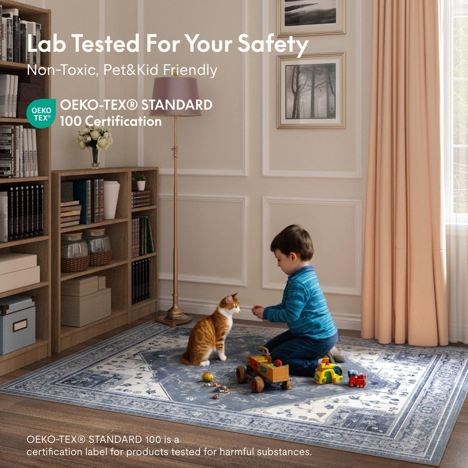 - Lab-Tested Safety: Crafted from 100% polyester chenille, the rug cover pairs with a 1/5-inch pad made of non-toxic EVA foam and thermoplastic resin—both latex and rubber-free for added peace of mind. Certified by STANDARD 100 by OEKO-TEX, our rugs are rigorously tested for over 1,000 harmful chemicals, making them completely safe for children and pets.