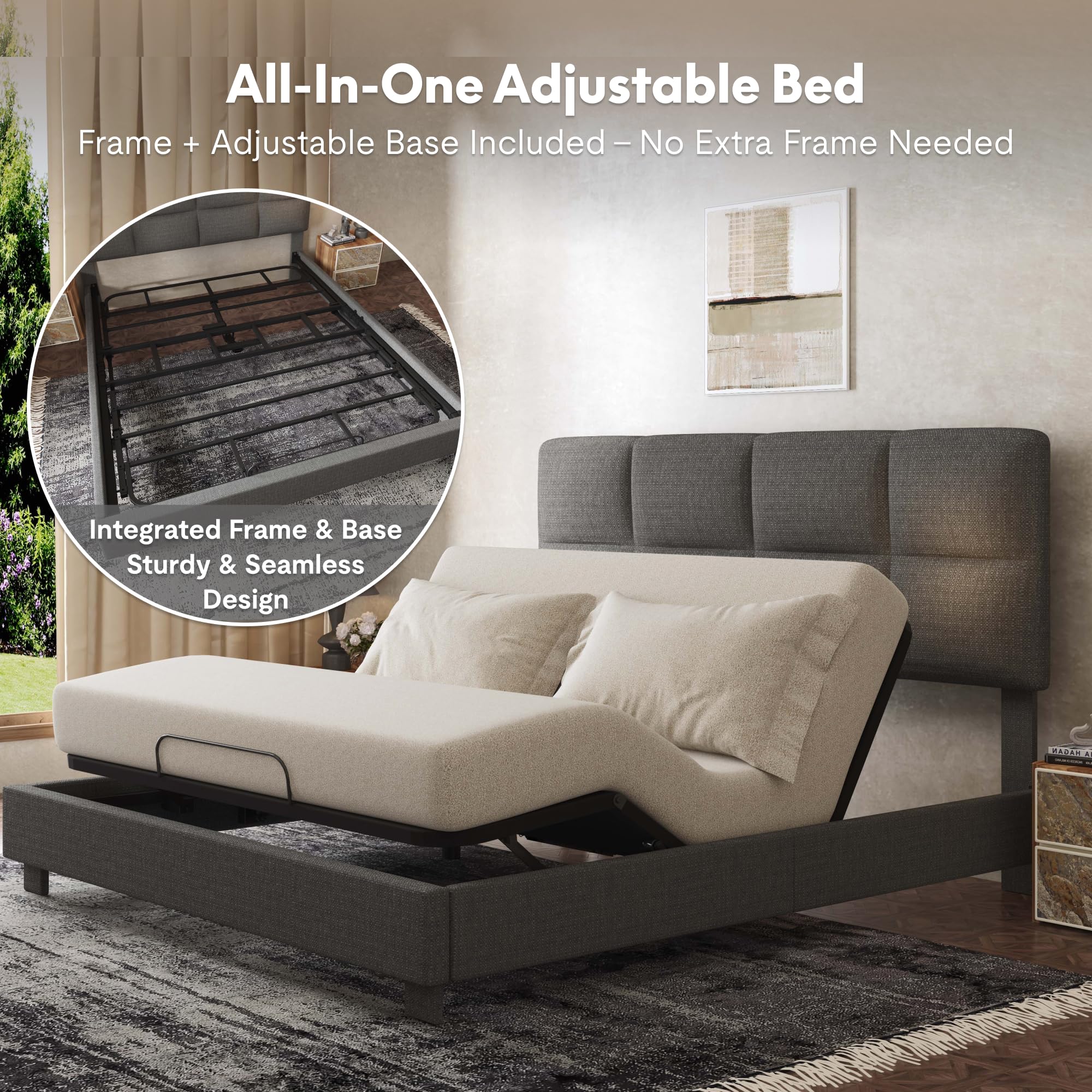 - All-in-One Adjustable Bed Design:Integrated frame and adjustable base in one sleek unit—no separate base needed—for a clean, modern minimalist look and effortless setup.