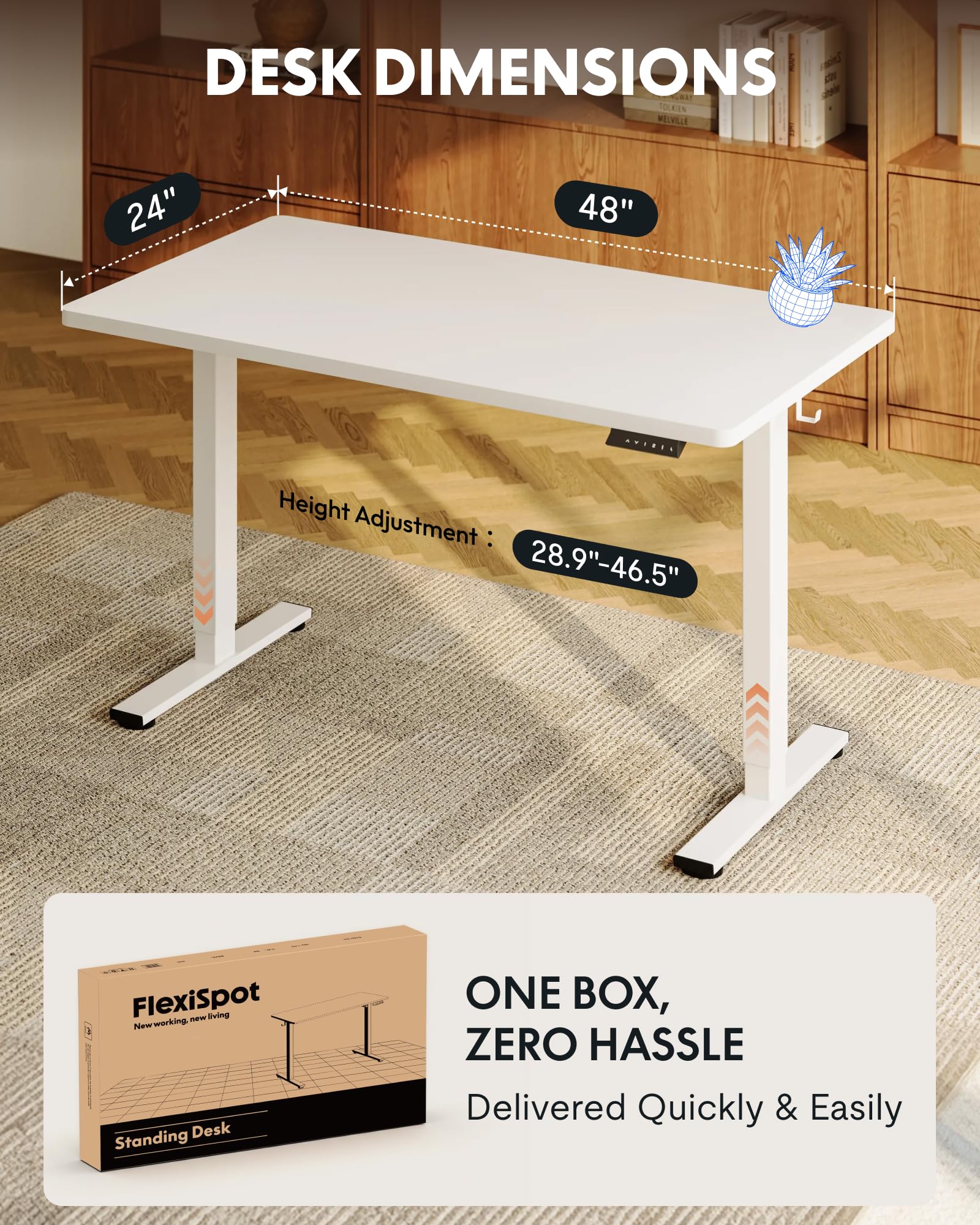FLEXISPOT EN1 One-Piece Standing Desk, 48"x24" Seamless Desktop Electric Height Adjustable Desk for Home Office, Multi-Monitor Setups & Easy Assembly, White